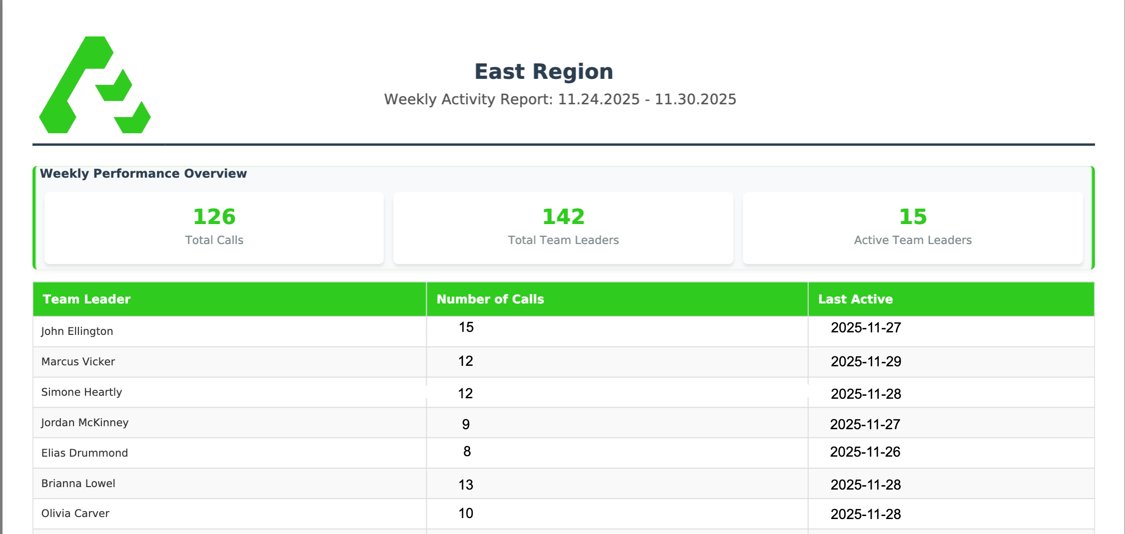 A new weekly email report that gives leaders a quick snapshot of team activity, including total calls, calls reviewed per leader, and last active times.