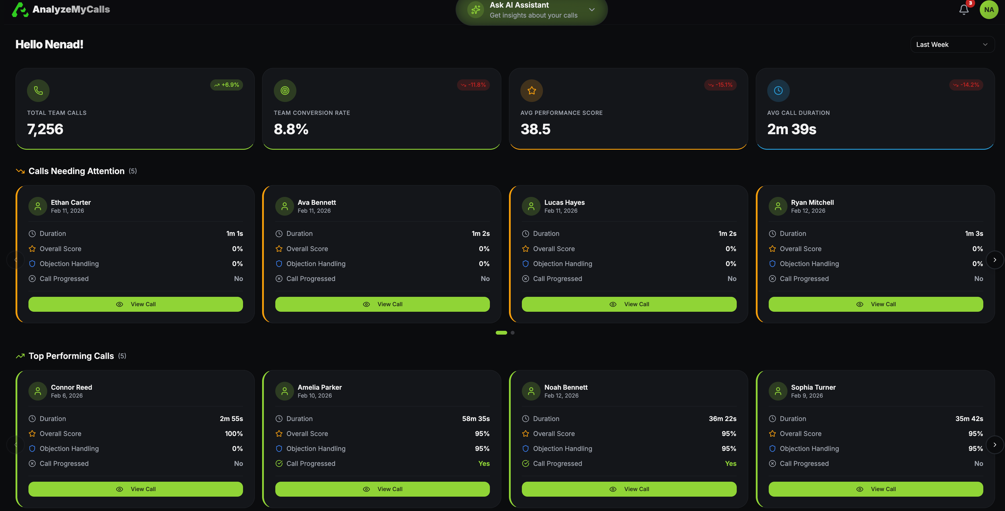 Call cards on the manager homepage now show key metrics for selected calls from the previous week, making it easier to spot issues and take action quickly.
